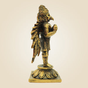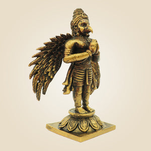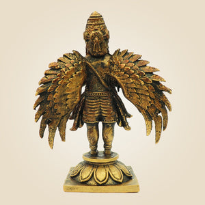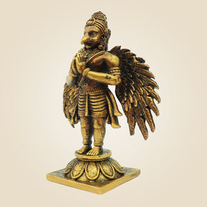 The 3.25-inch bronze Garuda Idol is one of the most powerful yet majestic additions to any space as it represents the vahan of Lord Vishnu. This idol is a handmade sculpture. Made with premium quality bronze, this idol is perfect to be placed in the sacred section of the house or as a decor piece in the living room. Furthermore, one can also place this idol in their home temple near the Lord Vishnu's Idol.