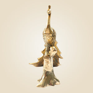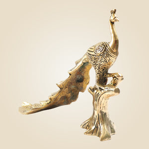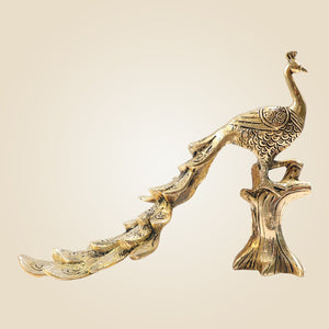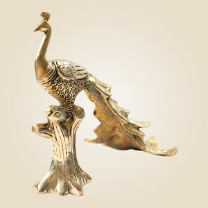 Decorative Brass Peacock - Elegant Statue Sitting on Tree Trunk for Home Décor