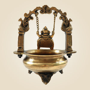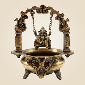 Elegant Brass Ganesh Idol on Jula Swing with Urli for Home & Gift Decor - 9.25"