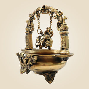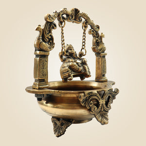 Add a charm of divine beauty to your space with this 9.25-inch Brass Ganesh Idol seated gracefully on a jula, adorned by a traditional urli at the base. Expertly handcrafted from premium brass, this piece blends spiritual energy with artistry. The swing moves back and forth, symbolizing balance and rhythm in life. Ganesha on a jula reminds us to stay centered and composed through life's ups and downs.