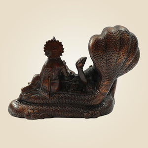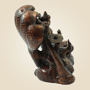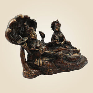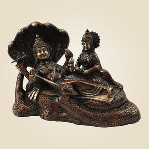 Breathtaking symbol of immortal spirituality, this 7-inch Hand-Painted Brass Idol on Sheshnag beautifully depicts Lord Vishnu reclining gracefully on the mighty serpent Ananta Shesh, with Goddess Lakshmi seated beside him in devotion. This symbol represents the balance of creation and prosperity.