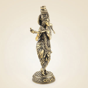 Handcrafted Krishna Brass Idol 9.5" - Flute Player Murti with Decorative Base