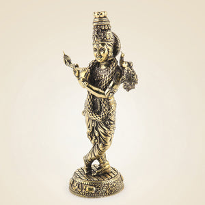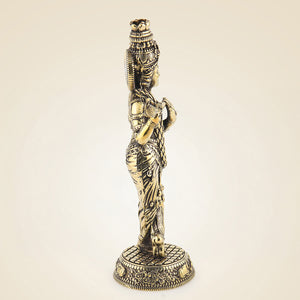 Fill your life and space with love and harmony by adding the handcrafted Krishna brass idol to your space. Measuring 9.5 inches, this idol depicts Lord Krishna playing the flute on a decorative base. This Idol will bring along Joy, harmony, and divine blessings when added to any home. Made using pure brass, it is the perfect Idol for everyday Puja rituals, festive decor setup for days like Janmashtami, or for completing the decor setup for religious ceremonies or special occasions. The superfine finish and detailing of the idol make it perfect as a gifting option as well for your friends and family. Additionally, this Idol is perfect to be used as both a spiritual and decorative piece. It will fill your home with the divine blessings of Lord Krishna and make it a positive space.