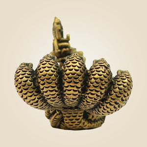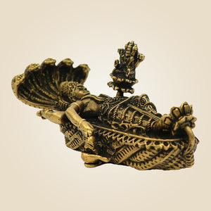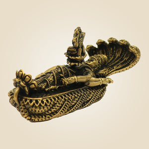 Measuring 1.5 inches, this handcrafted bronze idol represents the lord Vishnu in his Anantashayana form. This is going to be one of the most divine yet majestic idols to be added to your home. It is very small in size, but it is a powerful piece. Made using solid bronze, this one captures Lord Vishnu sitting on Sheshnag. Not only is it perfect for sacred sections of homes, offices, or workplaces, but also for home temples.