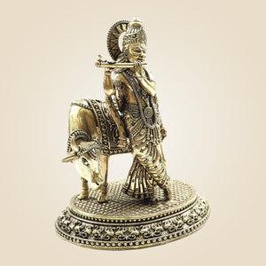 Krishna with Cow Brass Idol – Flute Playing Divine Murti - 5"