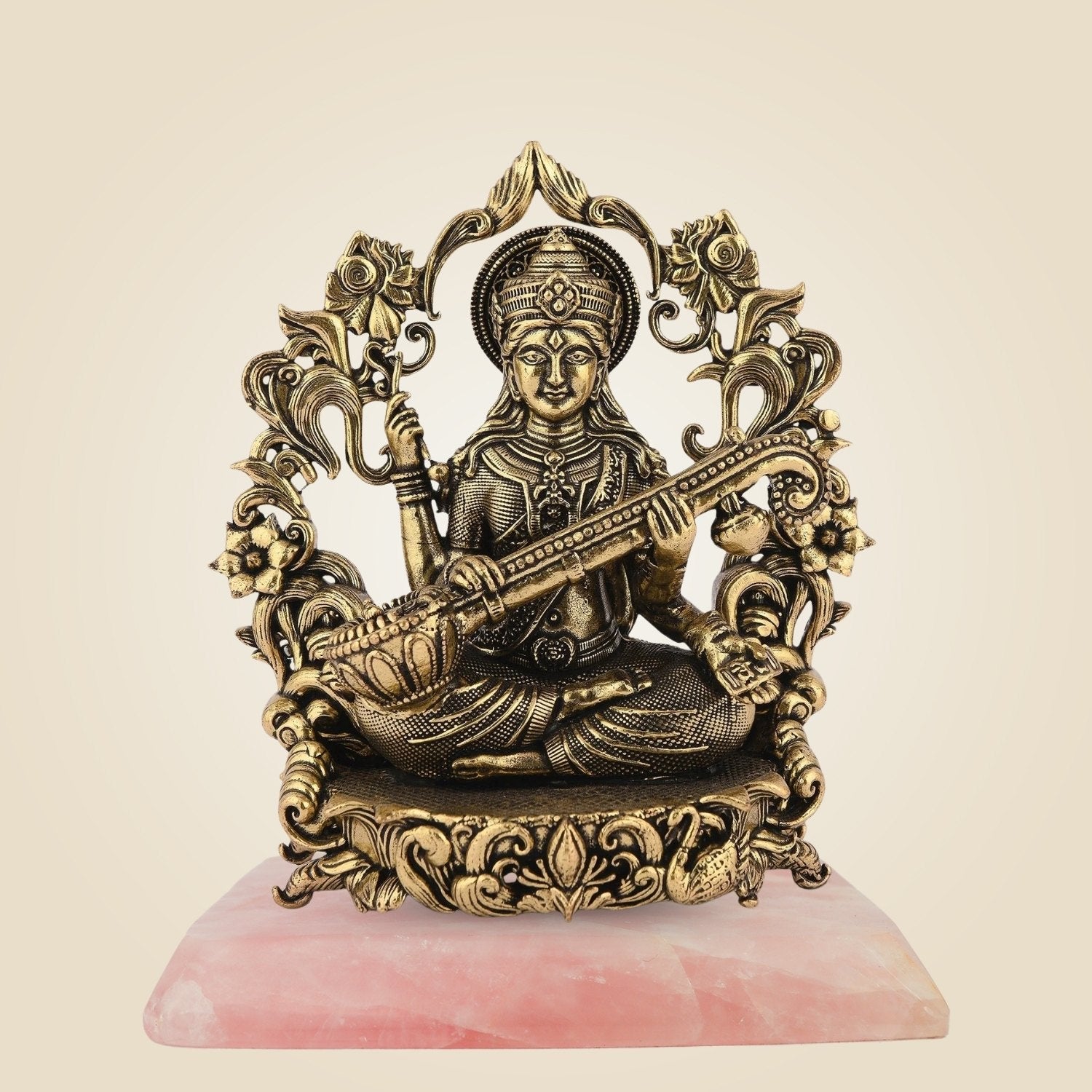 Witness the graceful presentation of goddess Saraswati in a 3.75 in Saraswati Maa brass idol. Saraswati Maa blesses her devotees with wisdom and knowledge in life. This handcrafted brass-made idol is perfect for those who want to enhance their focus. It is ideal for not just your mandir space but also a study room, meditation room, or even a library. Whether you want to use this idol at the time of your everyday worship or make it a part of festivals or religious ceremonies done on days like Saraswati pooja, it will suit all settings. Its compact size makes it even more handy. As it is small in size, it fits perfectly in smaller spaces as well. Go ahead to place it on your study table, office desk, sacred corner of the house, or altars. It will make an excellent and very thoughtful gift for students, teachers, and those who are willing to seek knowledge in their lives and walk on the path of spirituality.