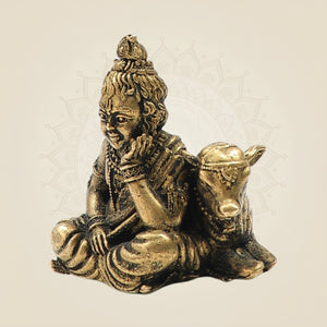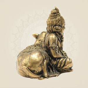 1.5" Bronze Bal Krishna Resting with Cow – Vintage Look Spiritual Showpiece