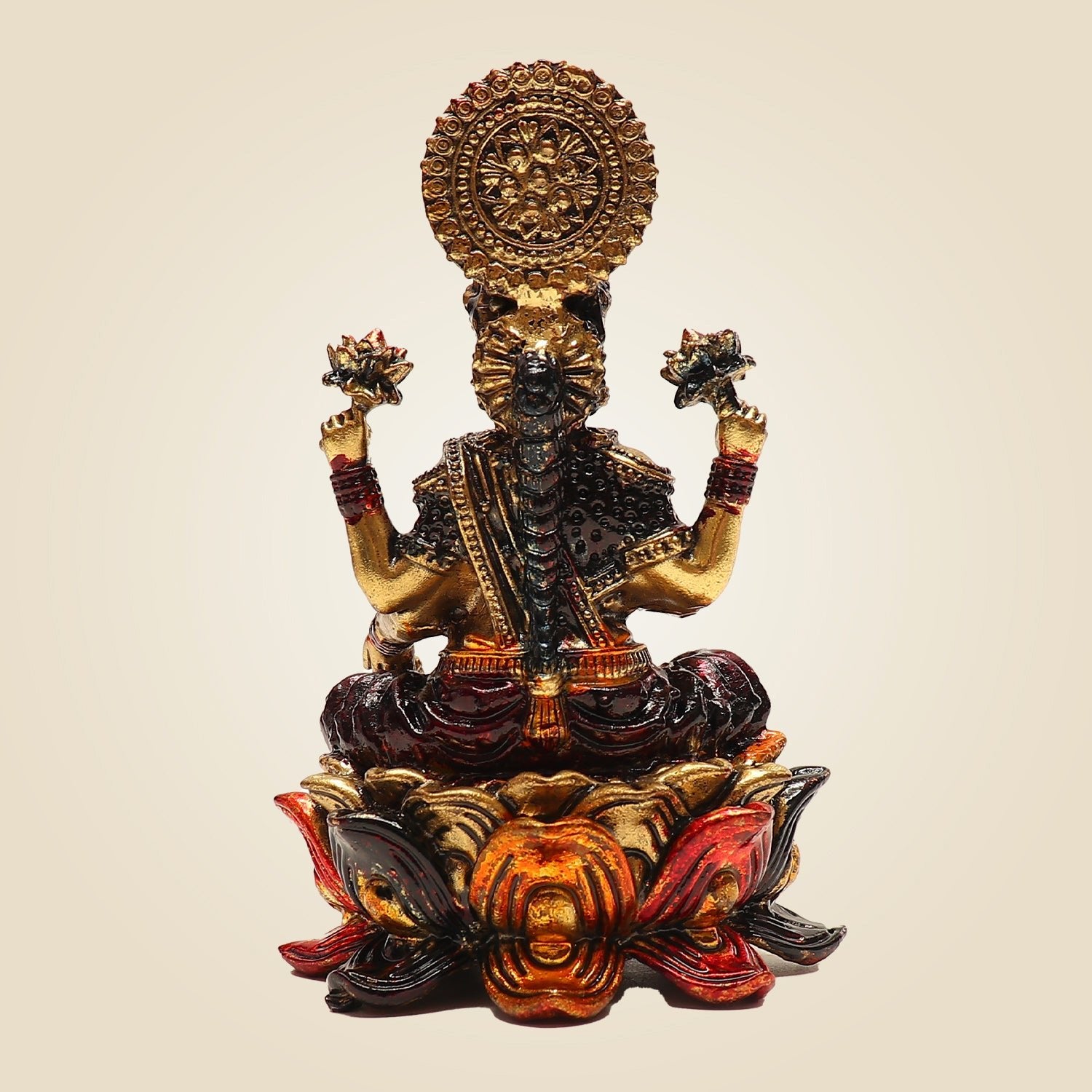 Gracefully seated on a blooming lotus, Lakshmi Maa looks stunningly beautiful in this 4.25 inch brass idol. This is perfect for your pooja room or sacred decor. The lotus in this idol symbolizes purity, while her raised hand blesses all the devotees with wealth and prosperity in their lives. By placing this idol in your festival setup on days like Diwali or other Pooja rituals like Lakshmi Pujan, it completes your setup in the most aesthetically pleasing way.