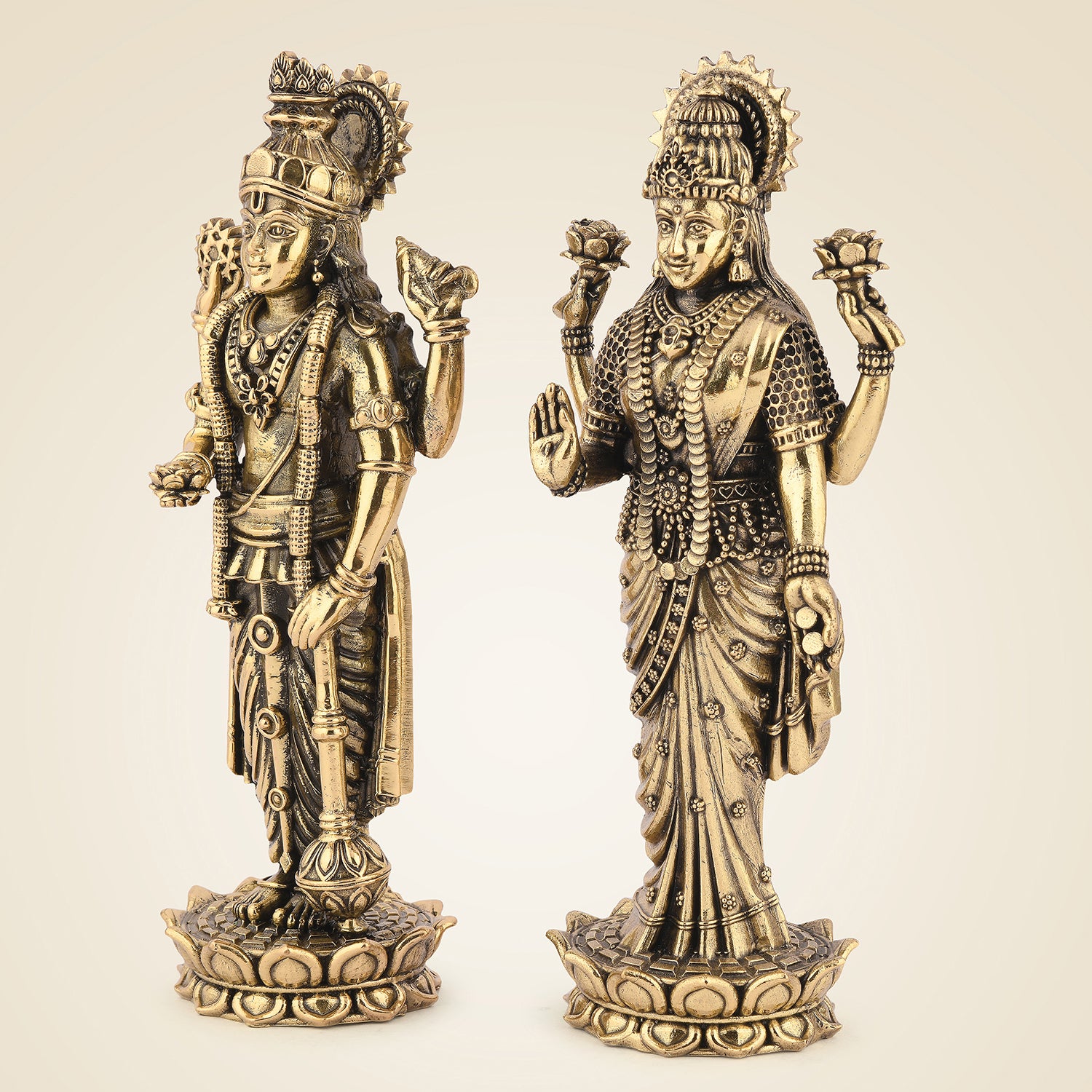 Bring home the blessings of Goddess Laxmi and Lord Vishnu with this beautifully crafted 5-inch brass idol, set atop an intricately designed lotus base. Handcrafted with care, this idol captures the divine essence of prosperity, protection, and harmony. The radiant brass finish adds a spiritual glow to any setting, making it ideal for daily puja, festive rituals, or simply as a sacred centerpiece in your home or office.