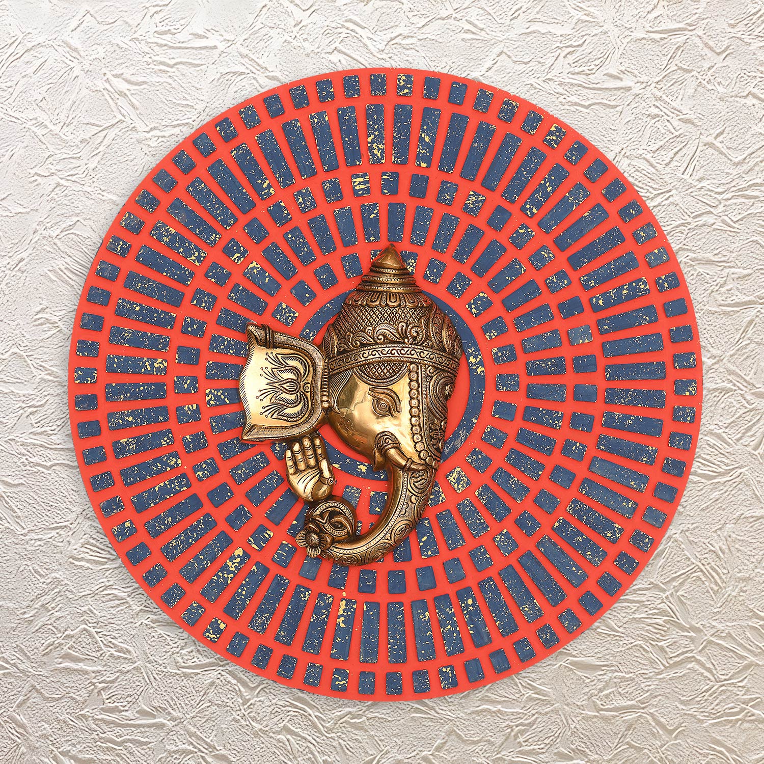 Elevate this spiritual ambiance of your house by bringing home the 21.75-inch wooden wall frame featuring the face of Lord Ganesha. This is a striking and eye-catching wooden wall frame which is the perfect addition to any space as a spiritual and sacred piece. The brass-made face of Lord Ganesha is set on a wooden base in the center. The frame is designed using geometric patterns with colors blue, orange shade, and golden. Furthermore, this frame is not just a spiritual addition to your home but will also make an excellent decor piece and elevate the overall look of your house. Use it in your living room, at the entrance of your home, in hallways, and other spaces as well. Additionally, it will make a very thoughtful gift for various festivals, religious ceremonies, or special occasions like birthdays, weddings, etc.