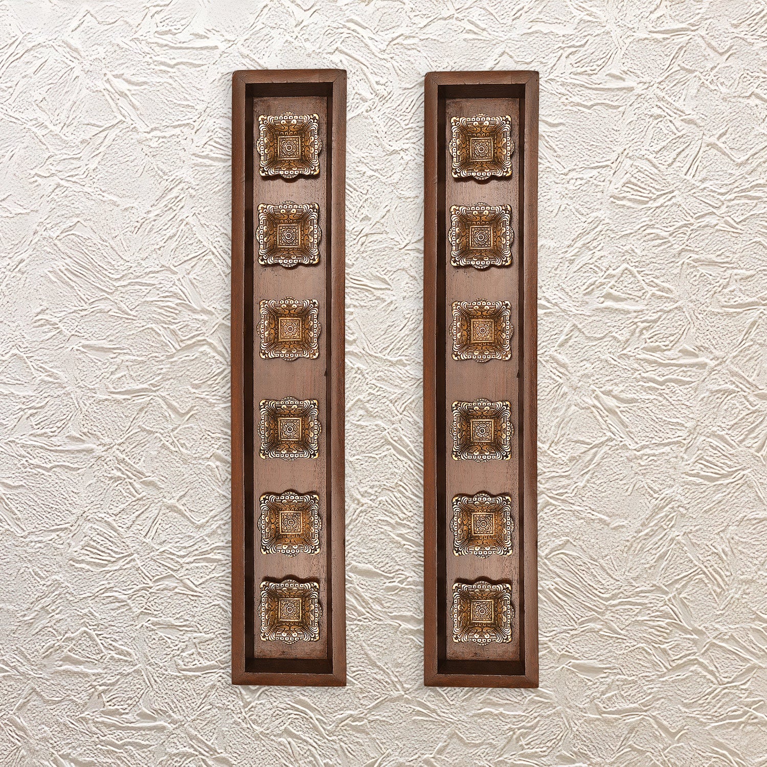 Elevate the overall look of your home by bringing the elegant 27 inch wooden wall frame which has 6 brass made diyas. Furthermore, these diyas are set on a wooden frame. These diyas are set on a rectangular-shaped wooden frame, made with dark brown wood that gives a rustic and rich look, making this wall frame extremely elegant.