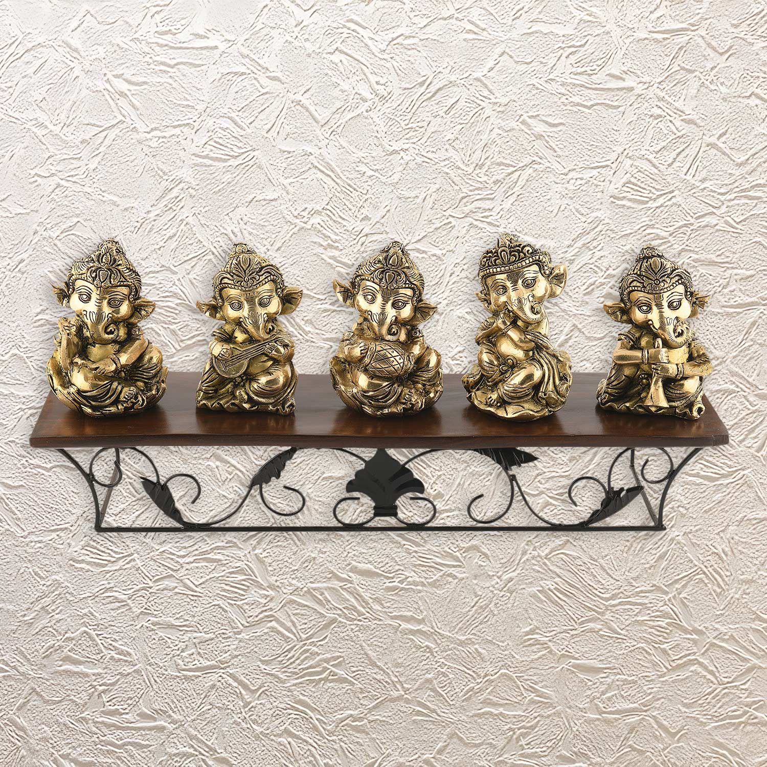 5 Musical Ganesha Idols on Designer Wall Shelf 19" • Artistic Home Display Set