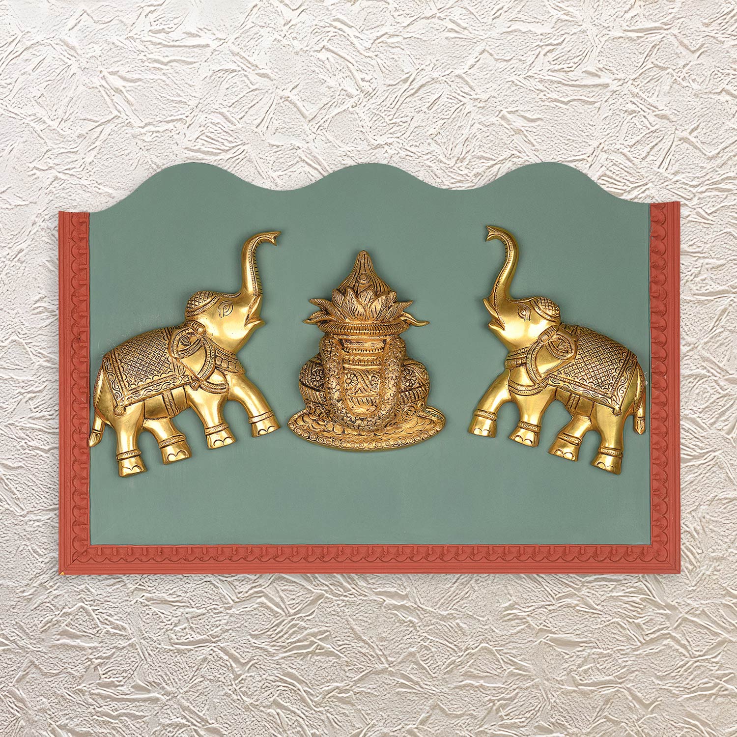 Brass Elephant Pair with Kalash in Wooden Wall Frame 16" Ethnic Home Accent