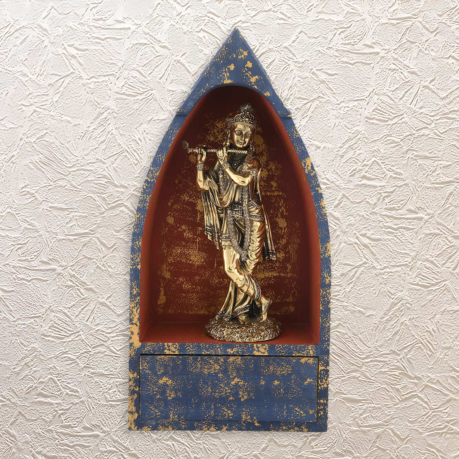 Bring home the beautiful handcrafted 16-inch wall frame which features the standing Lord Krishna and also has a drawer attached to it. Made in the arched temple shape is this majestic and elegant wooden wall frame. This wall frame measures 16 inches and has a Krishna standing on the drawer. The frame is made using the royal blue color, the shade of red with which the golden is also used to make the whole wall frame look extremely eye-catching. Furthermore, as there is a drawer in this frame, one can keep things like incense sticks or other pooja-related things in that space. It is perfect for use for your own space or for gifting to your loved ones at festivals and religious ceremonies.