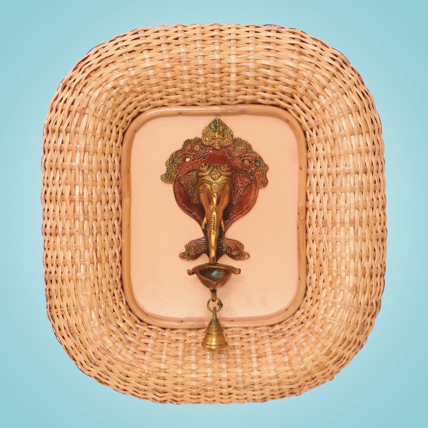 Brass Ganesh Wall Hanging with Bell & Diya in Cane Frame - 19"