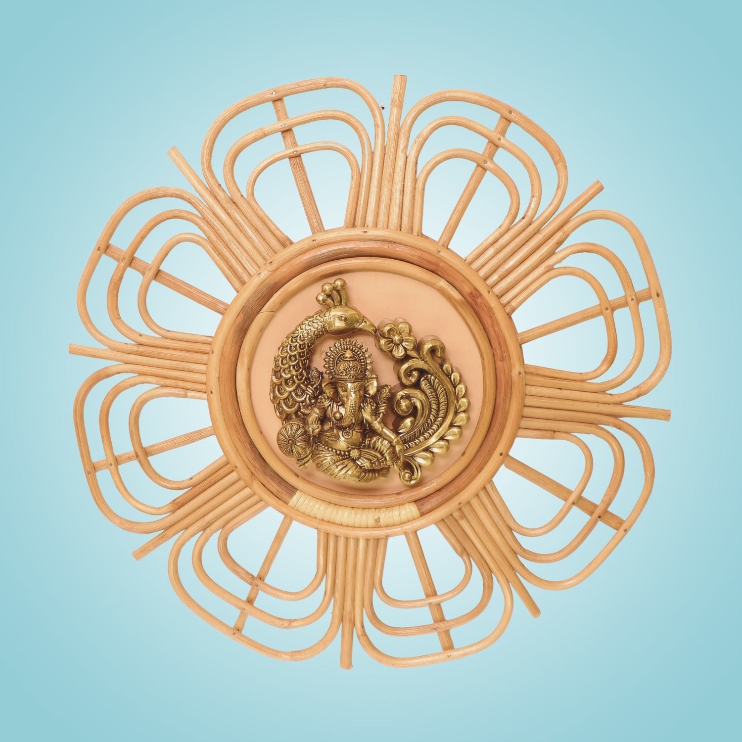 Brass Ganesha Wall Art 19.25" - Peacock Design in Bamboo Frame