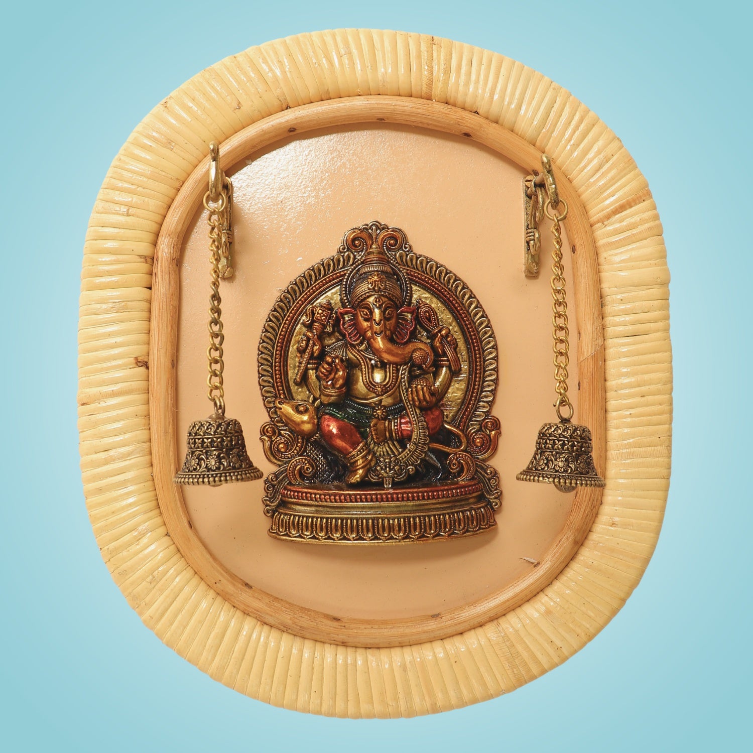 Brass Ganesha Wall Art • Cane Frame Hanging for Auspicious Ambience - 12.75"
