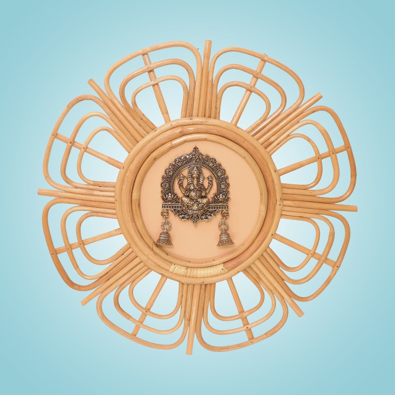 Brass Ganesha Wall Hanging • 2 Bells Bamboo Frame Art Decor - 19.25"