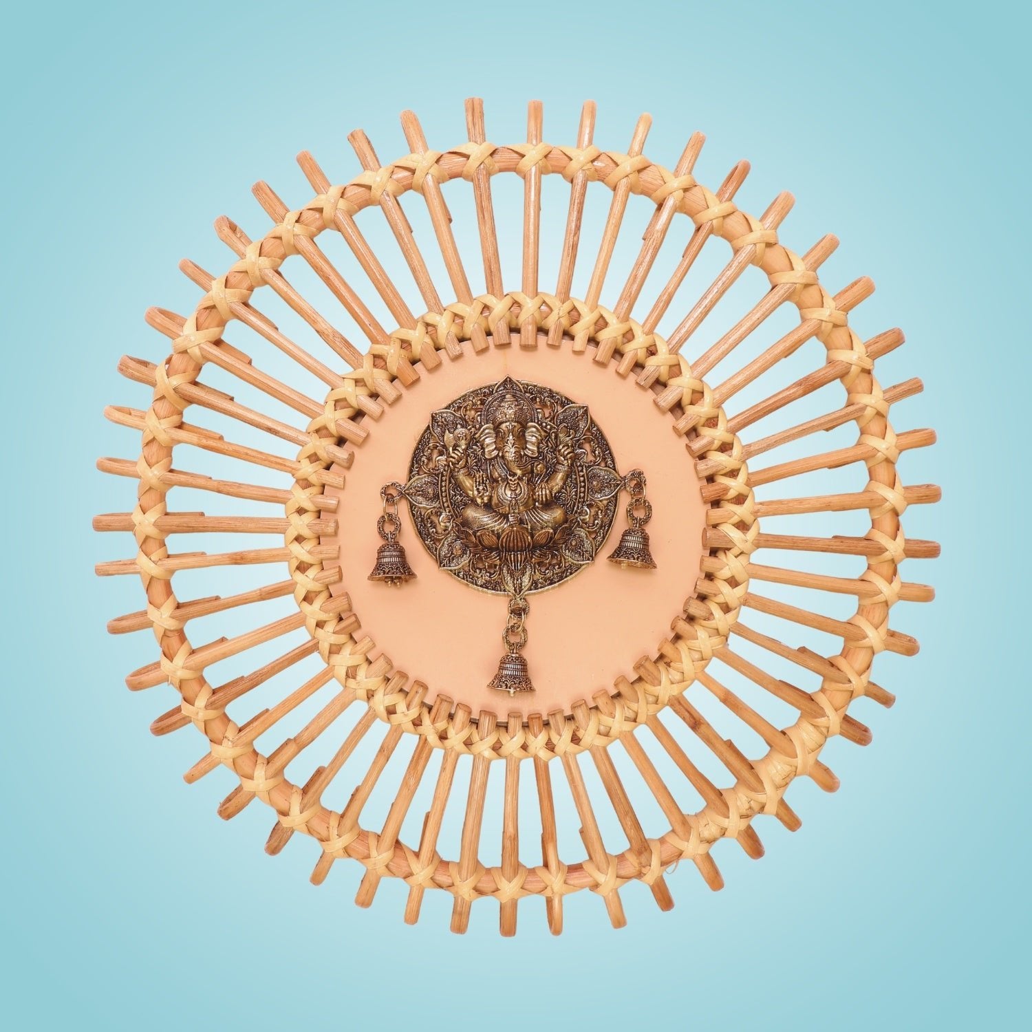 Brass Ganesha Wall Hanging Bell Art • Bamboo Wall Frame Décor Piece - 20"
