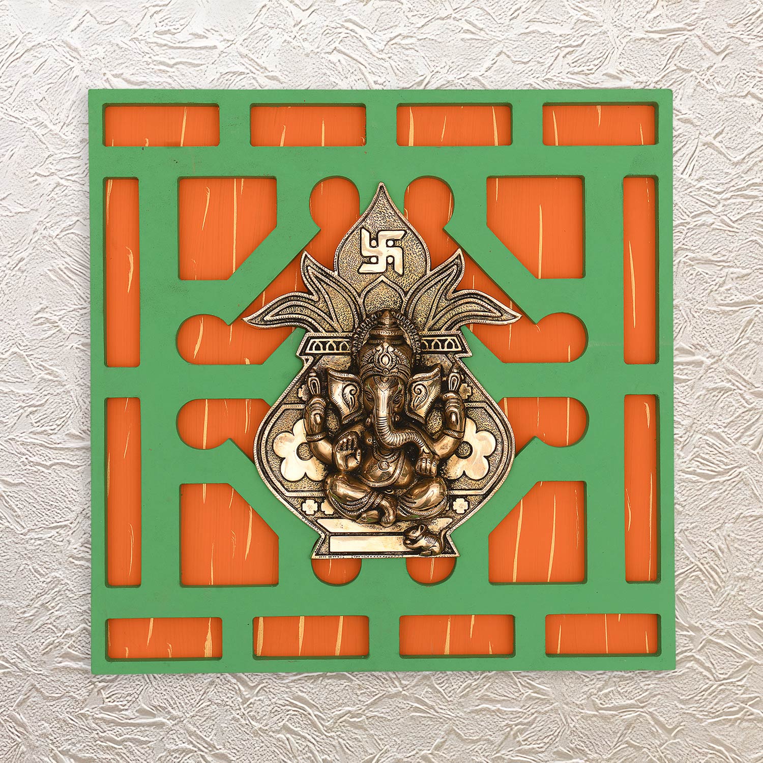 Invite the blessings of Lord Ganesha and abundance by bringing home the wooden wall frame featuring Lord Ganesha with a hanging kalash. This wall frame measures 16 inches and is one of the most elegant and sacred wall frames to add to your space. In the middle of this frame, you will see the brass-made Ganesh Ji with a Kalash set on the wooden base. The base of the frame is painted with orange color, and on top of it green lattice design is made, which gives a royal and stunning look. Lord Ganesha is known as the remover of all obstacles. Therefore, bringing this wall frame home will allow you to get rid of all the negative energies and bring positive vibes and abundance to your life and space. Gift it as a sacred and spiritual piece to your loved ones as well.