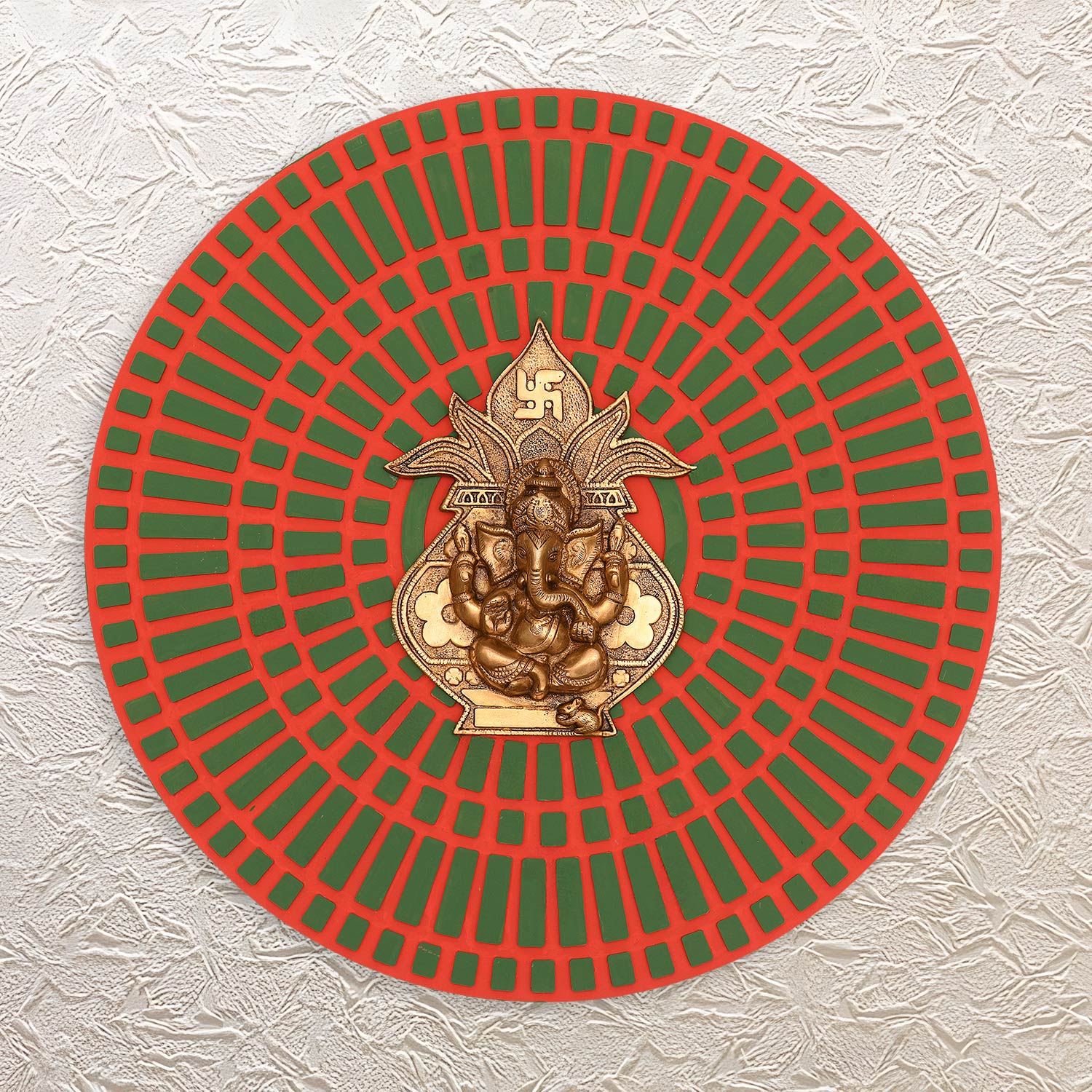 Round Wall Frame with Lord Ganesha 15"– Hanging Brass Idol in Wooden Art