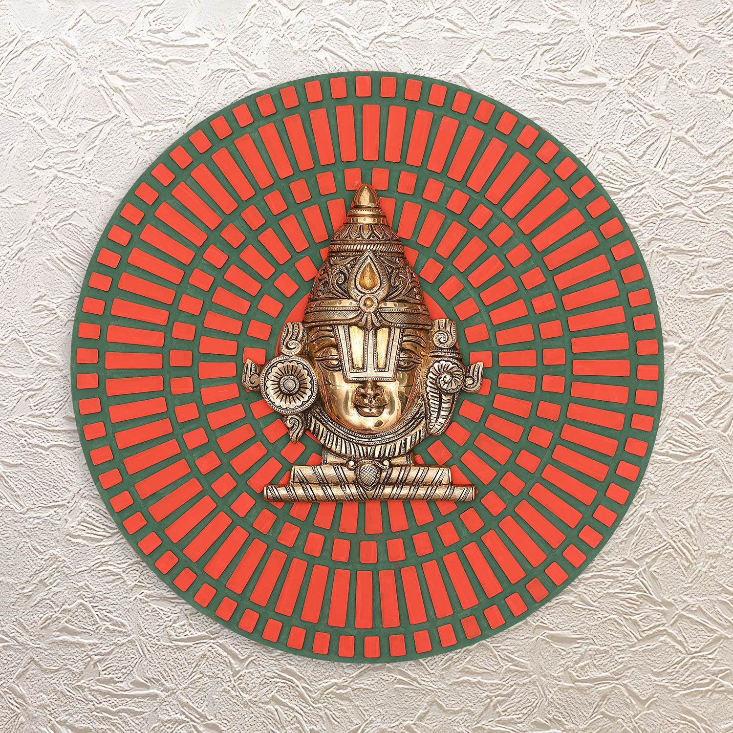 Open doors to the blessings and grace of Lord Venkateswara with this wooden wall frame measuring 21.75 inches. This sacred wall frame is not only ideal as the perfect decor piece but it will also be a sacred and spiritual addition to the walls of your home. The brass-made face of Lord Venkateswara is set on a round wooden frame which is made using alternating red and green patterns. This geometrical pattern gives a beautiful look to this wall frame making it perfect for use at your home, office, or as a thoughtful and mindful gift for your loved ones. Gift it to your friends and family on special occasions like Diwali, weddings, and other religious ceremonies.