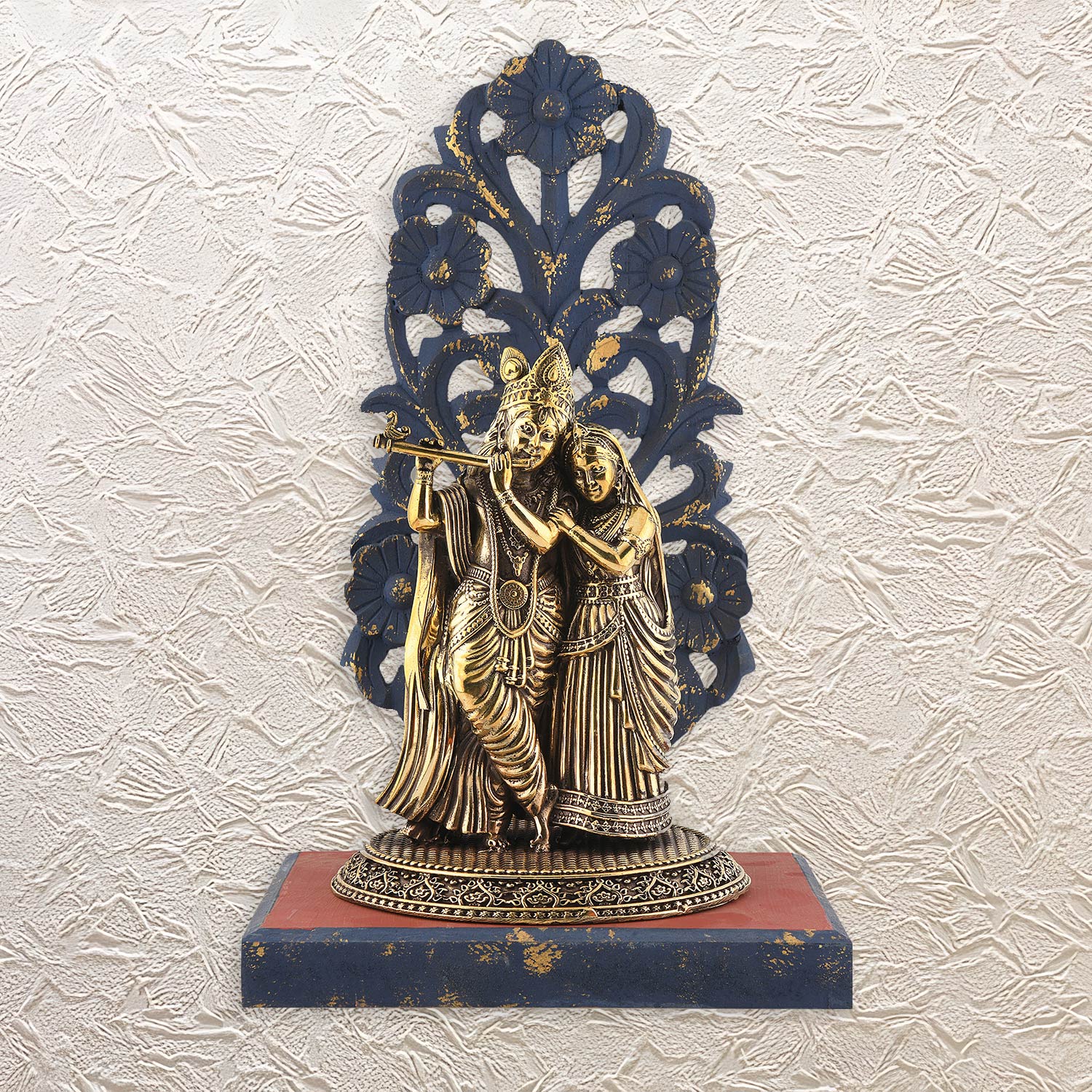 Wooden Tabletop with Radha Krishna – 12.75" Brass Idol for Spiritual Decor & Vastu
