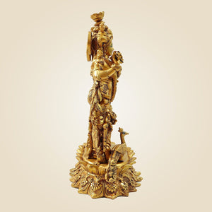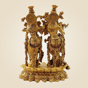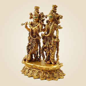 This South Indian Style Radha Krishna Brass Idol with Peacock is a captivating piece of divine decor that perfectly blends spirituality with artistry. Standing at 13.5 inches, this idol beautifully depicts Lord Krishna with his flute and Goddess Radha, representing their eternal bond of love. Crafted from high-quality brass, it features a radiant golden finish. The peacock feathers add an enchanting touch, making the statue a timeless addition to any space.