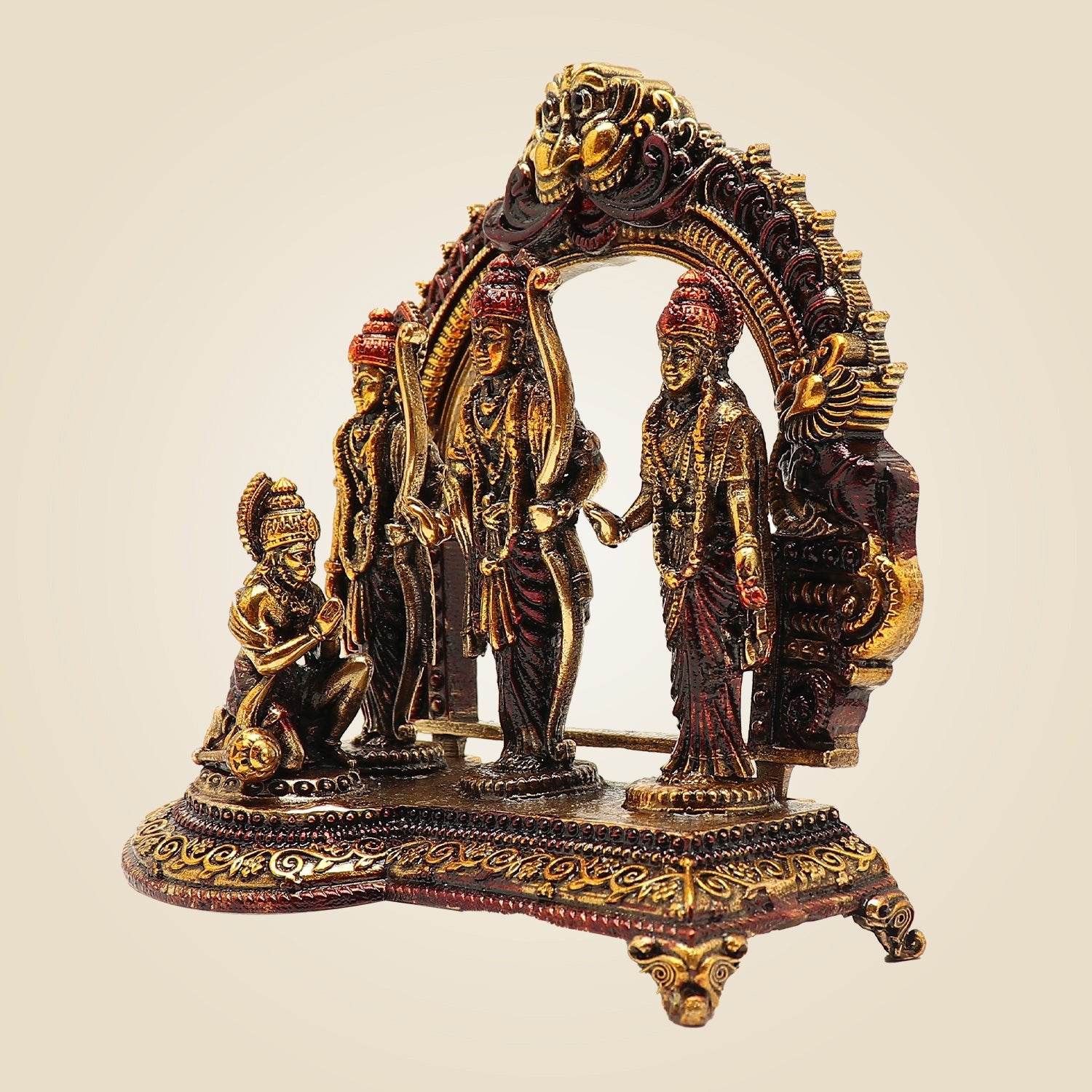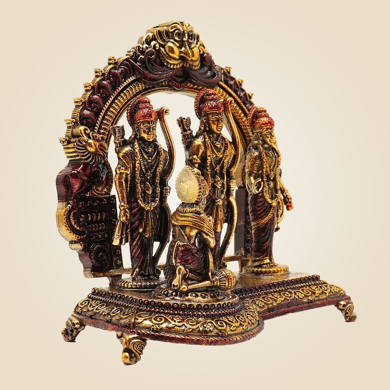 This finely crafted 5-inch Brass Ram Darbar idol set features Lord Ram, Goddess Sita, Lord Lakshman, and Lord Hanuman under a beautifully carved arch. Ram Darbar symbolizes the ideal family and is worshipped for love, unity, righteousness, and devotion. Lightweight yet durable, it is perfect for daily puja or placing in your home temple, living room, shelf, or office space. The idol is crafted from solid brass, which makes it radiate traditional elegance. Its divine presence allows the idol to complement any home decor setting beautifully and can also be presented during religious events, housewarmings, or festivals as a thoughtful gift. Invite divine blessings into your home with this Ram Darbar idol — a timeless symbol of faith, strength, and spiritual protection.