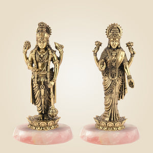 Bring home the blessings of Goddess Laxmi and Lord Vishnu with this beautifully crafted 5-inch brass idol, set atop an intricately designed lotus base. Handcrafted with care, this idol captures the divine essence of prosperity, protection, and harmony. The radiant brass finish adds a spiritual glow to any setting, making it ideal for daily puja, festive rituals, or simply as a sacred centerpiece in your home or office.