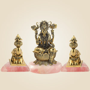 Add a sacred and auspicious idol to your space by bringing home the Gajalakshmi with elephants on a lotus Idol. This beautifully crafted 5-inch sculpture captures the majestic presence of Gajalakshmi with elephants offering her abhishekam or ritual bathing. The size of this Idol is perfect, which is not too big and not too small, making it ideal for multiple uses. It cannot only be used in the home Temple but also as a decor piece in the sacred section of your house. Made with perfection and premium-quality brass, this Idol represents prosperity and strength.