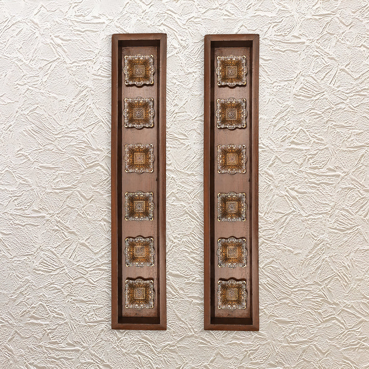 Elevate the overall look of your home by bringing the elegant 27 inch wooden wall frame which has 6 brass made diyas. Furthermore, these diyas are set on a wooden frame. These diyas are set on a rectangular-shaped wooden frame, made with dark brown wood that gives a rustic and rich look, making this wall frame extremely elegant.
