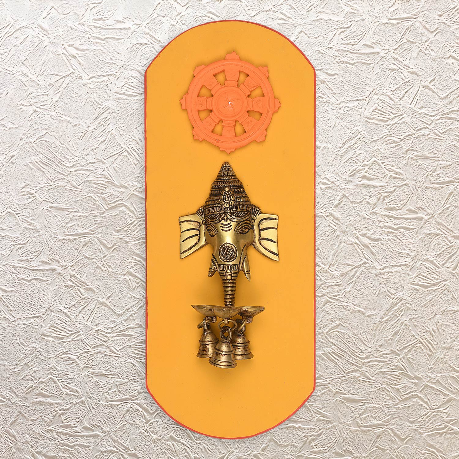 Welcome positivity, abundance, and good luck to your life and home with the Artistic Wall Frame with Ganesh Diya 17" Brass Finish. The devotees of Lord Ganesha must hang this at their home or office and add a spiritual piece to their space. In this wall frame, you will see Lord Ganesha and a Chakra featured, which is set on a saffron-colored backdrop. Not only is this a very elegant piece for any space, but it also brings positive energy and is ideal to be used for multiple settings.