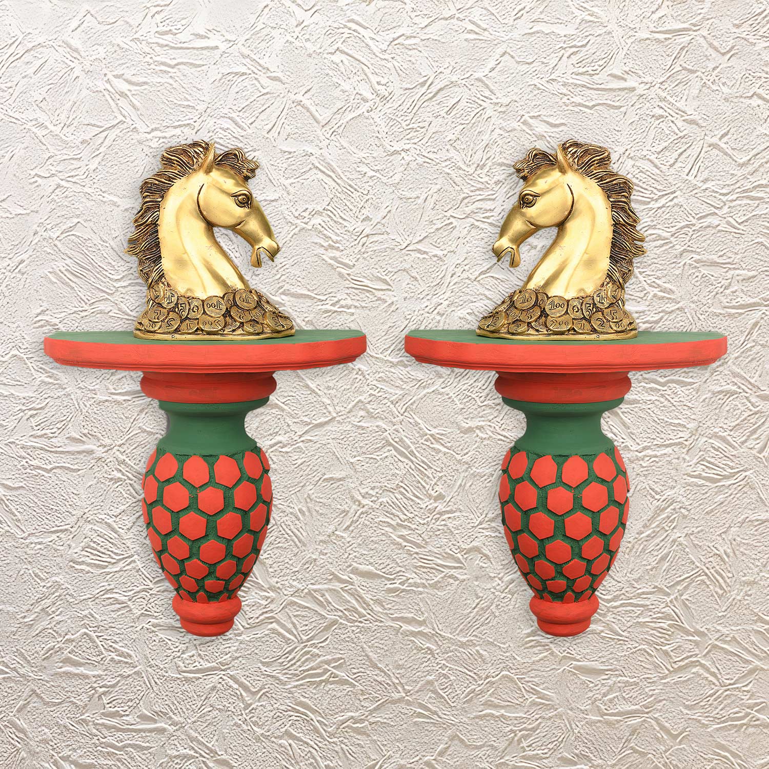 Add the twin horse heads on the wood wall shelf measuring 11 inches to your space and bring home a unique yet decorative piece for your space. This is one of the most vibrant pairs. The heads of both horses are made using brass, and they are beautifully mounted on the wooden wall brackets. These wooden brackets are made using the bold red and green colours and have a folk-inspired design, which makes them the most elegant and eye-catching addition to any home.