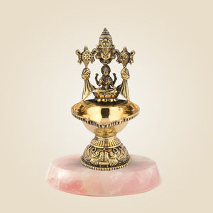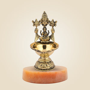 Welcome the divine light and grace to your space with this pure brass Balaji with Lakshmi Diya. This Diya measures 4.25 inches and is handcrafted using brass. As it is a brass-made diya, it is a durable and long-lasting addition to any space. Even with minimal care, it does not lose its shine.