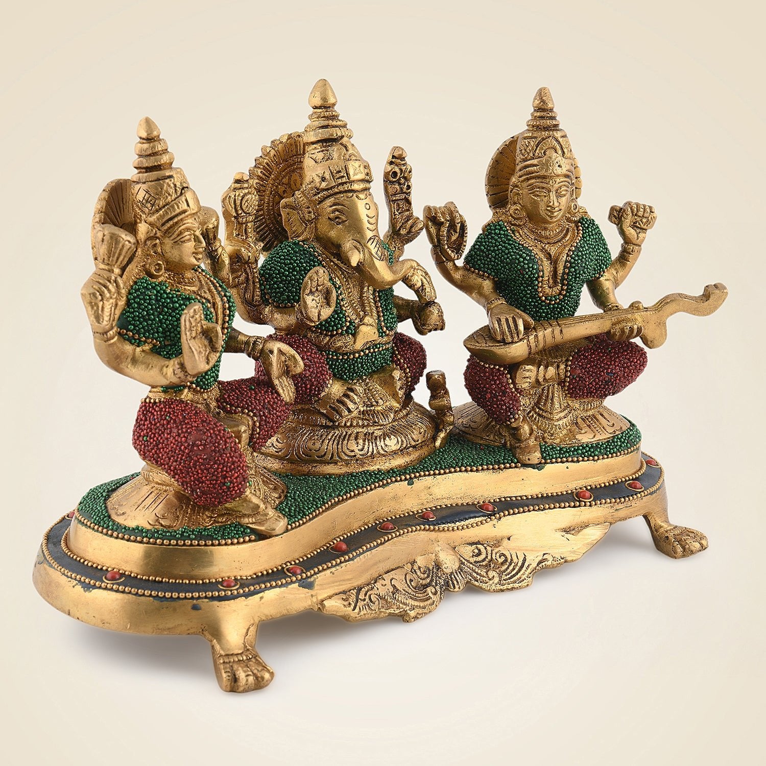 Divine Laxmi Ganesh Saraswati Idol – 6.5" Brass Murti with Stone Finish