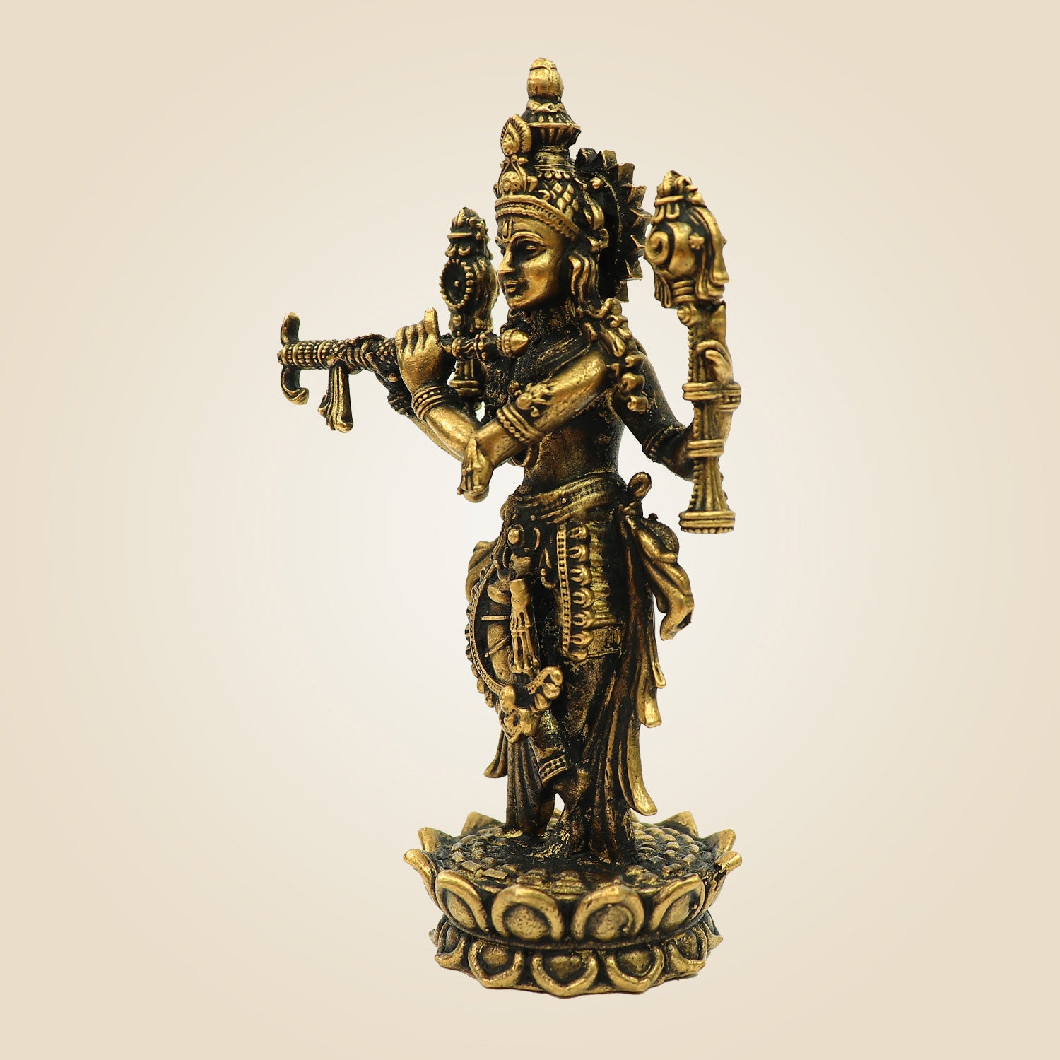 The bronze Krishna idol captures the divine Grace and charm of Lord Krishna—those who place the Statue of Lord Krishna open doors to harmony and joy. One can also pair the Krishna statue with Radha's idol and offer prayers every day.